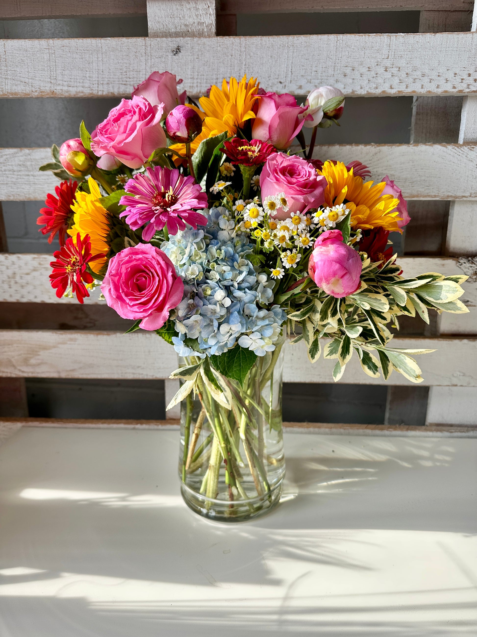 This enormous bouquet of mixed garden flowers is sure to impress! Set the tone with an amazing display of hydrangeas, sunflowers, roses, zinnias, and peonies.