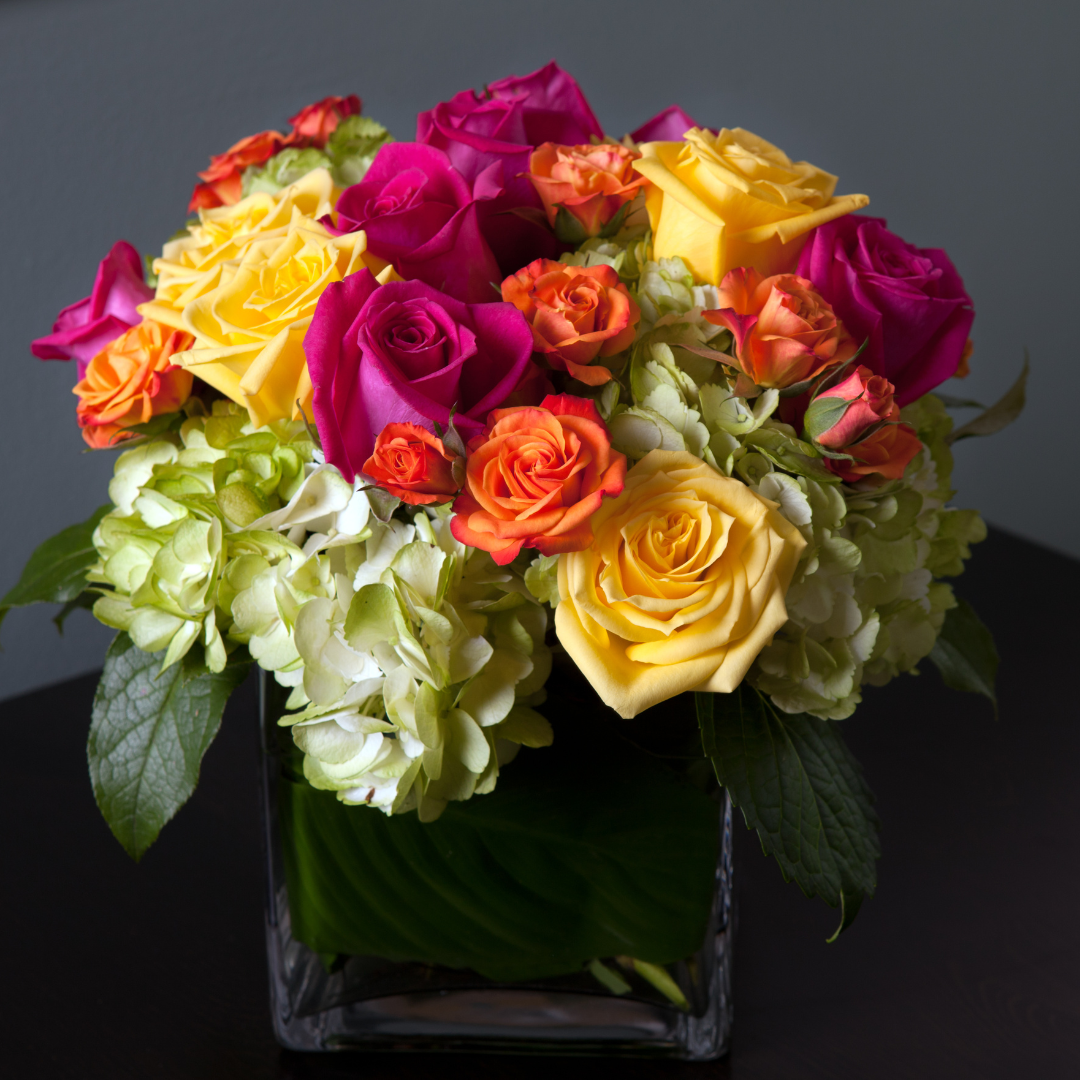 A vase filled with an elegant mix of fresh roses, hydrangeas, fillers and greens are a beautiful combination for any occasion! Colors will vary.
