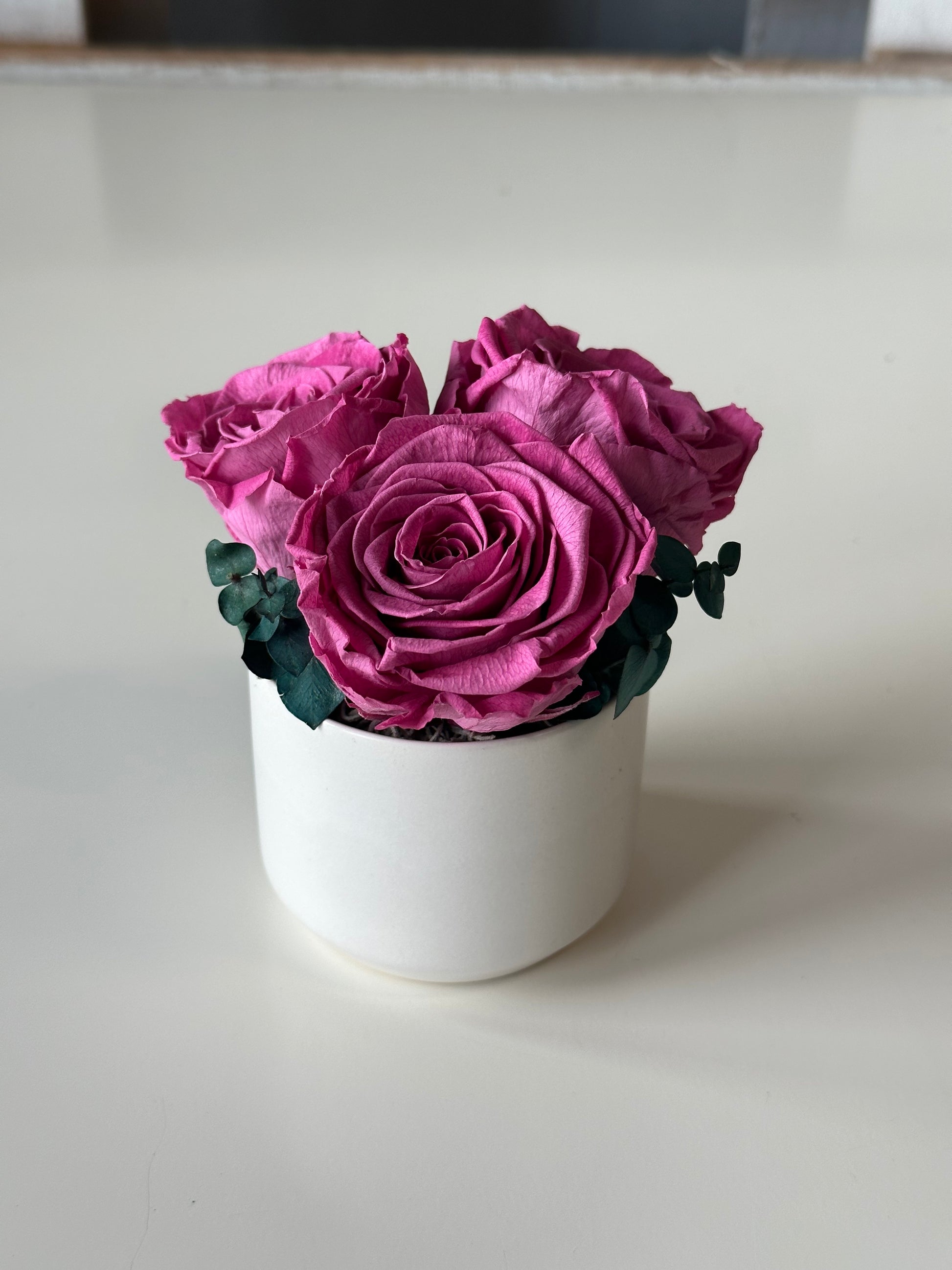Preserved roses require no watering or maintenance. For best results, keep out of direct sunlight, high humidity and high temperatures. With proper care, these arrangements should last a year or more.