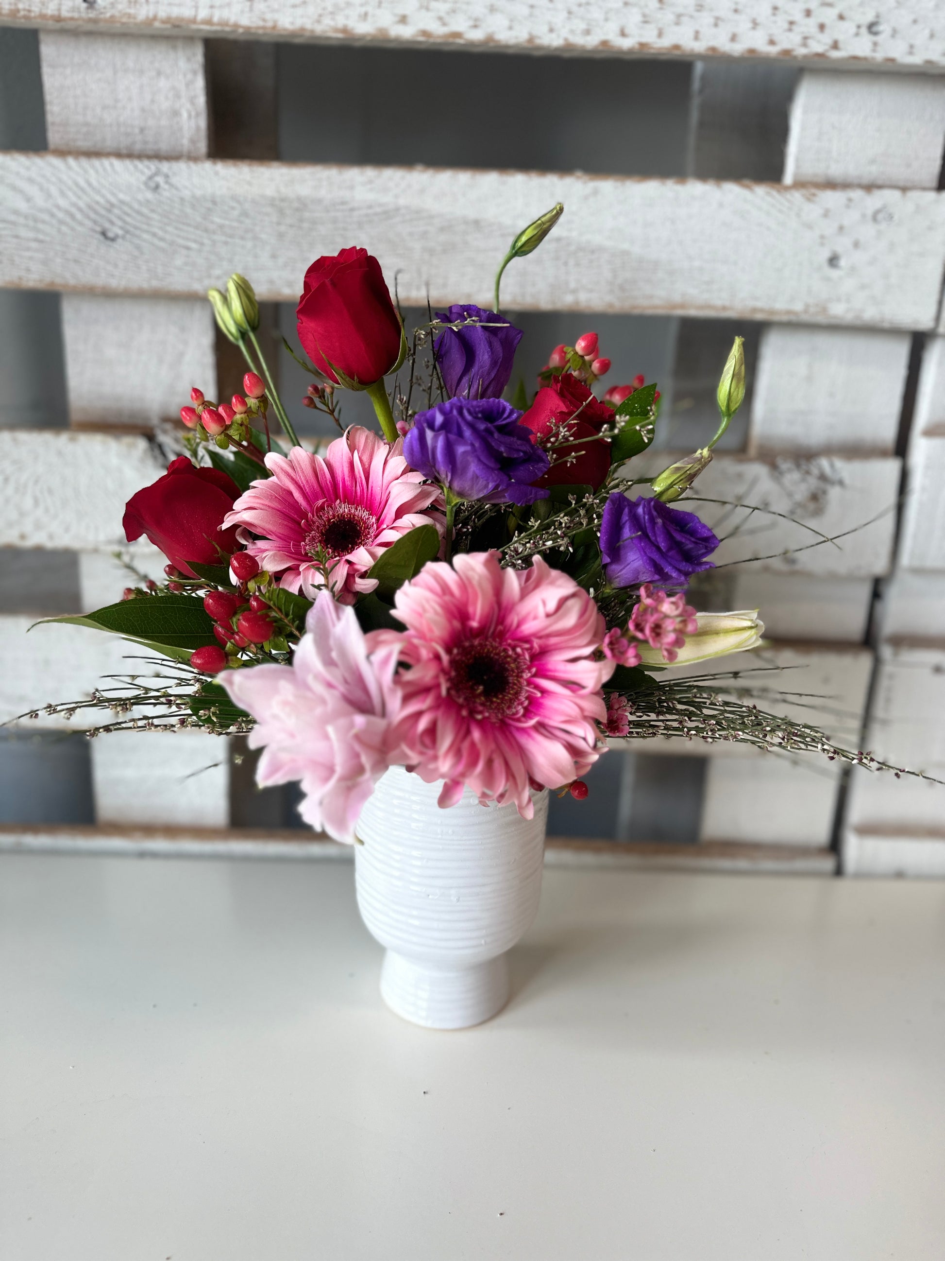 We are enamored with this fragrant beauty, and we think she will be too! This exquisite bouquet features a delightful blend of fresh double lilies, fragrant ginestra, elegant lisianthus, vibrant red roses, cheerful gerbera daisies, and vibrant hypericum, all expertly arranged in a sleek, clean white vase. A perfect gift for any occasion.