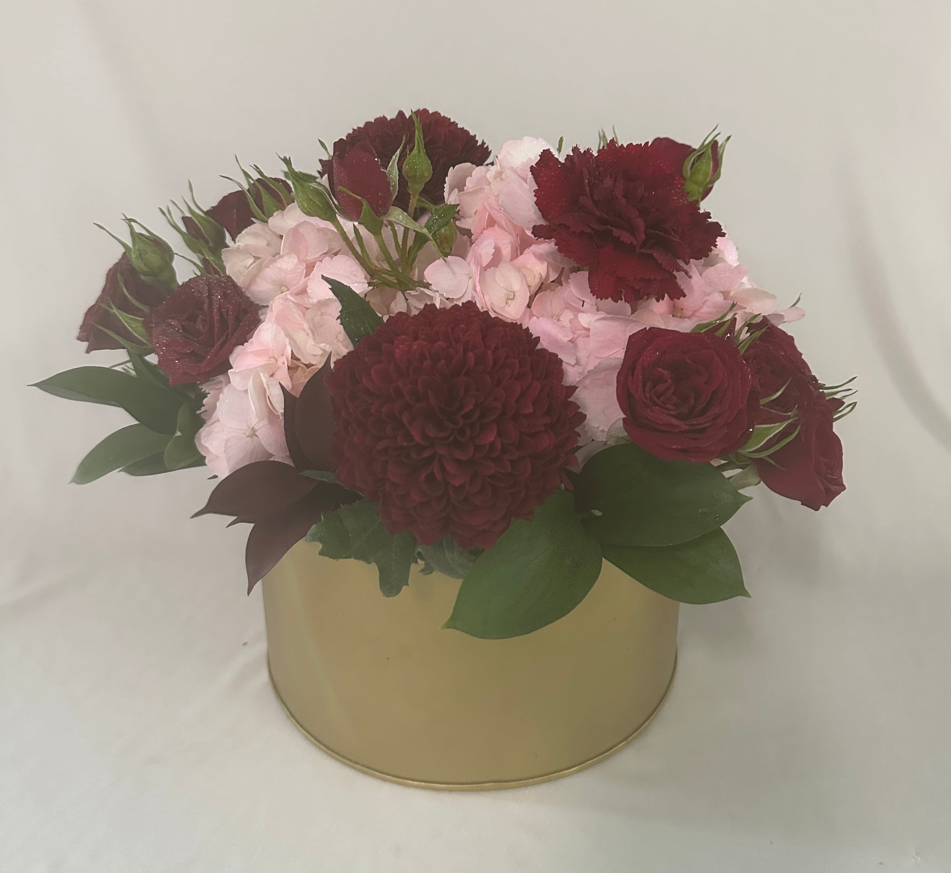 Deep wine colored flowers combined with pink hydrangeas in a gold cylinder, metal vase make for an absolute classic! (This arrangement makes a great table centerpiece.)